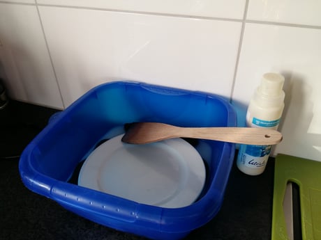 Dazu habe ich ein Putzbecken genommen. Gemäss Anleitung eine halbe Verschlusskappe der Wollimprägnierung in das Becken gegeben. Danach einen Liter kochendes Wasser (Wasserkocher) dazu gegossen und auf ca. 30° abkühlen lassen. Unbedingt, damit die Wollschlupfhose nicht zur "Schrumpfhose" wird!