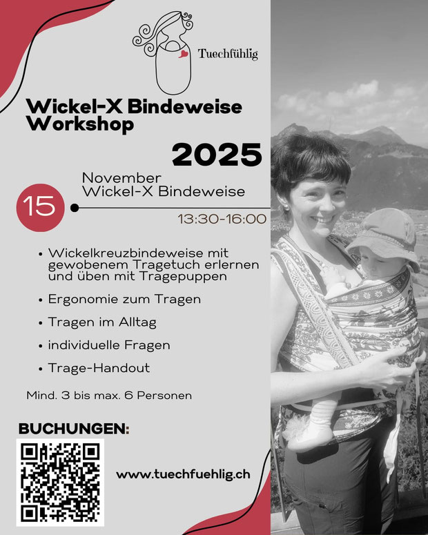 Der Workshop eignet er sich gut für Mütter/ Paare während der Schwangerschaftszeit aber auch nach der Geburt des ersten/ weiteren Kindes. Ebenso eignet sich der Workshop für interessierte Betreuungs-Bezugspersonen. Das Üben mit den Tragepuppen soll die Möglichkeit bieten entspannt die Trageweise zu verinnerlichen. Ich empfehle für Babys und Kleinkinder eine zweite Betreuungsperson zu organisieren, welche in der ersten Hälfte noch nicht teilnimmt um die Geduld der Kleinen zu schonen.